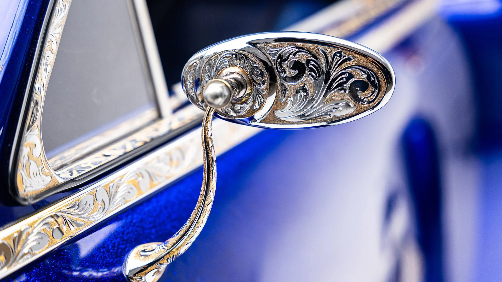 Frank Calderon of Salinas, California, first had his Chevrolet Fleetline “Captain ‘42” decorated with a red-and-blue paint scheme and adorned with murals of the Marvel comic book character Captain America when it won 2nd place for Bomb of the Year (a category for American cars from the 1930s through 1950s) at the Lowrider Super Show in 2018. Calderon then had the paint job updated, still superhero-themed and with additional airbrushed murals of military scenes painted by Tim Lowery and inspired by Calderon’s father’s naval service in World War II. The upgrade helped it to secure the show’s Bomb of the Year title for the following three years. Owners will frequently redo their vehicles’ appearance or add more decorative elements to score higher points at lowrider car shows and make them more competitive.